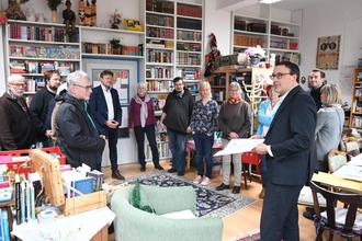 Sören Bartol (SPD), Parlamentarischer Staatssekretär bei der Bundesministerin für Wohnen, Stadtentwicklung und Bauwesen hatte es sich nicht nehmen lassen um als Jury Vorsitzender des Wettbewerb „Menschen und Erfolge 2022“ am Sonntagmorgen persönlich der StattBücherei in Großen-Linden zu ihrem Erfolg zu gratulieren. Diese hatte beim Wettbewerb eine mit 3.000 Euro dotierten Anerkennung erhalten. Insgesamt wurden im Themenfeld 1 „Begegnen“ zwei Projekte prämiert und eines mit einem Sonderpreis ausgezeichnet, während zehn eine Anerkennung erhielten. Ein Jahr zuvor war die StattBücherei mit dem Ehrenamtspreis der Stadt Linden ausgezeichnet worden, woran Bürgermeister Jörg König (CDU) in seinen Gratulationsworten erinnerte, wie auch daran, dass die Stadt letztendlich das 1895 als "Kleinkinderschule" erbaute und einst an die Kirche verkaufte heute unter Denkmalschutz stehende Gebäude zurückerworben hat um hier der StattBücherei eine Perspektive zu bieten. Mit 80.000 Euro wurden die seit dem Erwerb der Stadt in das Gebäude investierten Maßnahmen bezuschußt. Bärbel Weigand nahm gemeinsam mit Tochter Ida, Jan Balke und Brigitte Geist den Preis aus den Händen Bartols im Beisein des heimischen SPD-Bundestagsabgeordneten Felix Döring in Empfang. Unter dem Motto "Neu füreinander in der Mitte" wurden beim diesjährigen Wettbewerb "Menschen und Erfolge" Menschen gesucht, die sich mit ihren Projekten in den Themenfeldern Begegnen, Versorgen oder Wohnen erfolgreich für ein neues Füreinander in der Mitte in ländlichen Räumen einsetzen. „Neues wagen und experimentieren“ gehörte dabei zu jenen Kriterien die der Auszeichnung zugrunde lagen. Kriterien für die Jury bei der Preisvergabe waren Engagement, Beitrag zum Gemeinschaftsleben, Kreativität und Innovation, Klimaschutz und Baukultur. Seitens der Stadtverordnetenversammlung gratulierten die beiden stellvertretenden Stadtverordnetenvorsteher Dr. Christof Schütz (Bündnis90/Die Grünen) und Gudrun Lang (SPD). Die Ehrung vor Ort erfolgte, weil aus Krankheitsgründen Vertreter der StattBücherei im November an der Preisverleihung in Berlin nicht teilnehmen konnten.