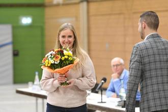 Stadtverordnetenvorsteher Fabian Wedemann (CDU/rechts) gratulierte gleich zu Beginn Julia Mergenthaler (CDU) zu ihrem Geburtstag an diesem Tag