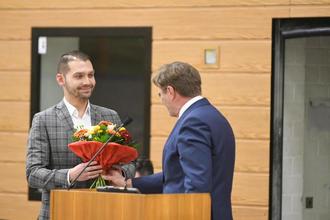 und erhielt sodann selbst einen Blumenstrauß aus den Händen von Bürgermeister Jörg König – nachträglich zu seiner Hochzeit überreicht