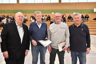 Durch den Präsidenten des Hessischen Handball-Verband (v. l.) Günter Eckert wurden mit der HHV-Ehrennadel in Gold Ulrich Lepper und Lothar Weigel ausgezeichnet, denen TV-Vorsitzender und HHV-Ehrenmitglied Josef Semmelroth gratulierte