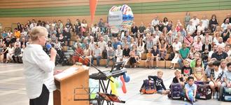 SEPTEMBER - Einschulungsfeiern wieder in gewohnter Form, wobei die Wiesengrundschule aufgrund der Sperrung der Volkshalle diesmal in die Stadthalle ausweichen mußte, wo Schulleiterin Karin Schramm 69 Schulanfänger mit ihren Eltern begrüßte