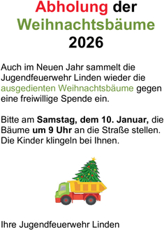 Auch im Neuen Jahr sammelt die Jugendfeuerwehr Linden wieder die ausgedienten Weihnachtsbäume gegen eine freiwillige Spende ein.