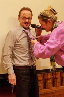 Christian Schmidt hatte nicht bedacht, dass an diesem Tag „Altweiberfastnacht“ war und somit Dorothee Wohlfeil ihn kurzerhand von seiner Krawatte erlöste ©Foto: Thomas Wißner