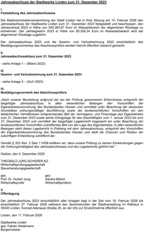 Der Jahresabschluss 2023 einschließlich aller Anlagen liegt in der Zeit vom 16. Februar 2026 bis einschließlich 27. Februar 2026 während den Sprechstunden der Stadtverwaltung im Rathaus in 35440 Linden, Konrad-Adenauer-Straße 25, an der Info zur Einsichtnahme öffentlich aus.