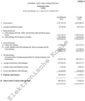Die Stadtverordnetenversammlung der Stadt Linden hat in ihrer Sitzung am 10. Februar 2026 den Jahresabschluss der Stadtwerke Linden zum 31. Dezember 2023 festgestellt und beschlossen, den Jahresverlust 2023 in Höhe von 545.363,67 Euro im Wasserbereich der allgemeinen Rücklage zu entnehmen. Der Jahresgewinn 2023 in Höhe von 65.304,34 Euro im Abwasserbereich wird der allgemeinen Rücklage zugeführt.
