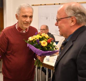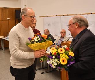 Stadtverordnetenvorsteher Axel P. Globuschütz (Bündnis90/Die Grünen) überreichte gleich zu Beginn Blumen an Stadtverordneten Dirk Schimmel (SPD/links) nachträglich zum 60. Geburtstag