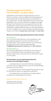 Haben Sie Interesse mit Ihrem Verein, Ihrer Jugendgruppe oder -Verband an der Jugendsammelwoche teilzunehmen? Dann melden Sie sich, bis zum 14.03.2025, bei der Stadtverwaltung unter a.kielstein@linden.de, oder unter 06403 605-95.