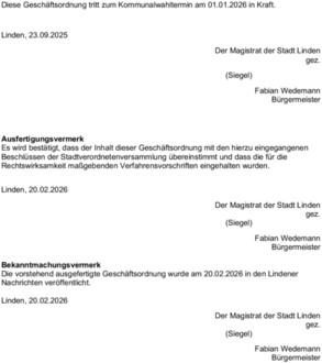 Die vorstehend ausgefertigte Geschäftsordnung wurde am 20.02.2026 in den Lindener Nachrichten veröffentlicht.