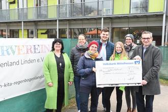 50 Jahre Regenbogenland Leihgestern werfen ihre Schatten voraus. Auch wenn das goldene Jubiläum erst am 16. Juni gefeiert werden soll, so hat sich der im vergangenen Jahr gegründete Förderverein bereits um eine Mitfinanzierung bemüht. Sollte von dem Geld zunächst ein Puppentheater in der Volkshalle bezahlt werden, so muß dieses jedoch aufgrund der Hallensperrung ausfallen. Deshalb hat sich der vor zehn Monaten gegründete Förderverein Regenbogenland für das Jubiläumsfest bereits eine Überraschung einfallen lassen, die vorab noch nicht verraten werden soll. Dank der Volksbank Mittelhessen gibt es zum Vereinsjubiläum einen kräftigen Zuschuss für die Vereinskasse. Alexander Zippel, Regionaldirektor der Volksbank Mittelhessen überreichte nun dem Vorstand des Fördervereins einen Spendenscheck über 1.500 Euro für die Jubiläumsfeier. Vorsitzende Theresa Keil nahm gemeinsam mit ihrer Stellvertreterin Meike Keil, Kassiererin Christine Ginter, Schriftführerin Liesa Dort, Beisitzer Marc Böger und Kindergartenleiterin Heike Strobl die Spende in Empfang. Unser Foto zeigt (v.l.) Regenbogenland-Leiterin Heike Strobl, Meike Keil, Vorsitzende Theresa Schmidt, Marc Böger, Christine Ginter, Liesa Dort und Regionaldirektor Alexander Zippel. ©Foto: Thomas Wißner