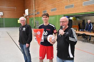 So dass Kapitän Vincent Grützner (Mitte) Wimpel udn Ball aus den Händen von Alfred Blaschke (rechts) in Emopfang nehmen konnte