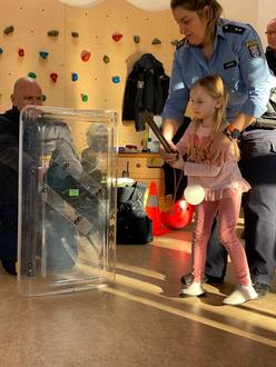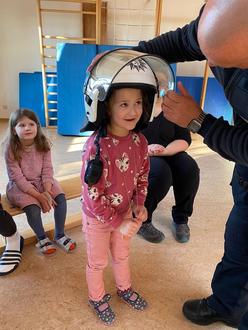 Zur großen Freude der Kinder durfte man auch die Polizeimütze, die Schutzweste und den -helm anziehen und so in die Rolle der Gesetzeshüter schlüpfen.