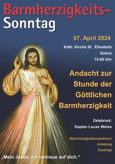 | 15.00 Uhr | Andacht zum Barmherzigkeitssonntag mit Kaplan Lucas Weiss, Solms (Kirche St. Elisabeth) |