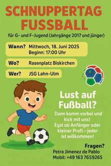 Am Mittwoch, den 18. Juni 2025, lädt die JSG Lahn-Ulm alle fußballbegeisterten Kinder der Jahrgänge 2017 und jünger herzlich zum Schnuppertag Fußball ein. Los geht’s um 17:00 Uhr auf dem Rasenplatz in Biskirchen.