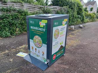 Jeder Haushalt hat einen kleinen Eimer und Papiertüten bekommen, um den Biomüll zum Behälter zu bringen. Um den Bioabfallbehälter aufzumachen braucht man eine Schlüsselkarte.