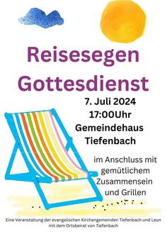| 17.00 Uhr | Reisesegen-Gottesdienst mit Superintendent Dr. Hartmut Sitzler im Gemeindehaus Tiefenbach |