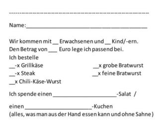 ein. Wir treffen uns um 10:15 Uhr am Pavillon und wandern gemeinsam zum Outdoor Zentrum. Wer nicht so gut zu Fuß ist, kann mit dem Bürgerbus fahren. (Bitte bei Anmeldung angeben) Ab 11 Uhr haben wir im Outdoor-Zentrum 2 Tipis mit Grillplatz gemietet. Für Getränke, Grillkäse, Steaks und Würstchen wird gesorgt. Über eine Salat- oder Kuchenspende freuen wir uns (Diese können am Pavillon abgegeben werden und werden dann zum Outdoor Zentrum transportiert). Im Outdoor Zentrum kann man die Tiere anschauen, den Spielplatz besuchen oder sich im Bogenschießen versuchen. Wir wollen einen schönen Tag miteinander verbringen und lassen unseren Familientag nach Kaffee und Kuchen langsam ausklingen. Der kleine Kostenbeitrag liegt pro Erwachsenem bei 10€ und pro Kind bei 5€. Bitte meldet Euch bis 09.08.2024 an. Füllt dazu einfach den unteren Abschnitt aus, steckt ihn in einen Umschlag, legt das Geld passend dazu und werft ihn bei Nicole Schöler oder Verena Herrmann ein. Selbstverständlich könnt Ihr euch auch telefonisch bei Nicole (410345) oder Verena (922728) anmelden. Wir freuen uns auf Euch