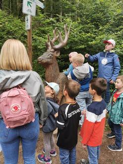 Die Erzählung über die geheimnisvolle blaue Maschine, die eines Tages im Wald auftaucht und die Tiere vor Rätsel stellt, fesselte die Kinder von Anfang an. Mit Spannung in den Augen und einer Stempelkarte in der Hand machten sich die Kinder auf den 3 Kilometer langen Weg. An verschiedenen Stationen trafen sie auf liebevoll gestaltete Holztierfiguren, die die Geschichte zum Leben erweckten. Mit Freude und Begeisterung lauschten sie unseren Erzählungen über Hase, Hirsch, Fuchs und Igel und stempelten fleißig ihre Karten ab. Der Höhepunkt der Wanderung war zweifellos das Lüften des Geheimnisses um die blaue Maschine.
