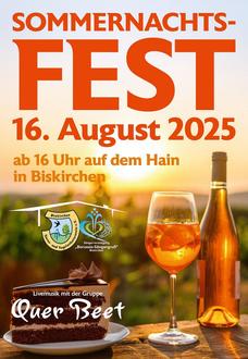 Auch in diesem Jahr wollen wir mit euch ein rauschendes Sommernachtsfest feiern. Wir beginnen um 16 Uhr bei Kaffee und Kuchen und gehen dann nahtlos zu kühlen Getränken und Heißes vom Grill über. Für die richtige Stimmung sorgt auch in diesem Jahr wieder Querbeet. Seid ihr dabei? Der Natur- und Vogelschutzverein Biskirchen und wir freuen uns auf euch!