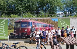 Mit 16 Teilnehmer/innen ging es pünktlich auf die ehemalige Bahntrasse Richtung Beilstein. In Holzhausen wurden wir von Karl-Heinz Schäfer vom Heimat- und Geschichtsverein empfangen, der uns einen kleinen Einblick in die Geschichte der Region gab. Es gab Informationen über den Tonabbau in Holzhausen und über die Ulmtalbahn die von Stockhausen bis Beilstein verkehrte. Der rote Schienenbus - Balkan Express genannt, ist in einem großen Bild am Rastplatz/ehemaliger Bahnhof in Holzhausen dargestellt. Beeindruckend für alle Teilnehmer/innen war der Hinweis der optischen Täuschung, welche die Betrachter des Bildes entdecken konnten. Auf diesem Weg noch einmal vielen Dank für die großzügigen Erfrischungen, die Familie Schäfer/Carina Wagner der Truppe spendete.