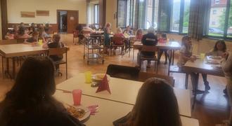 Am Mittwoch, den 2. August war es dann soweit. In der Zeit von 10:00 bis 14:00 Uhr trafen sich 25 Kinder im Alter von 6 bis14 Jahren, um das im Vorfeld ausgearbeitete Menü zusammen mit Elsbeth Wittkop, Lena Sattler und Sabine Straßheim im Gemeindehaus in Biskirchen zu kochen.