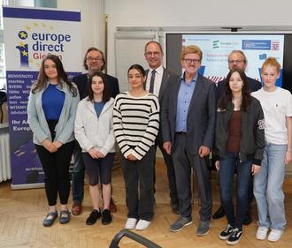 Das Bild zeigt die beiden Preisträgerinnen der IGS Solms, Sonja Lehle und Anna Sophie Grünhagen (v.l.), den Regierungspräsidenten Dr. Christoph Ullrich, den Landesvorsitzenden der Europaunion Thomas Mann und Roger Haberditzl sowie weitere regionale Preisträger.