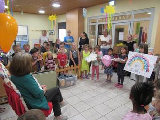 …hieß es vor einigen Tagen nicht nur für die Kinder der Kita Rabennest, die in die Schule wechseln, sondern die Kinder und Kolleginnen verabschiedeten sich von Helga Saloch, die in den wohlverdienten Ruhestand geht.