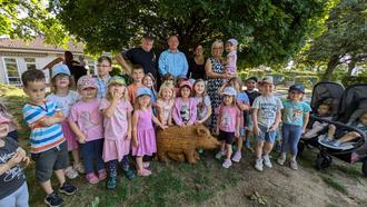 Eine Überraschung erwartete die Kinder nach den Sommerferien im Außengelände der Kita. Abgesperrt und unter einem weißen Tuch verhüllt, wartete das kleine Wildschwein auf seine Übergabe.