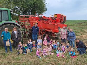 Am 15. September 2025 hieß es für die Delfin- und Schildkrötengruppe der Kita Zwergenland: Gummistiefel an und ab aufs Feld! Im Rahmen des Kartoffelprojekts besuchten die Kinder mit ihren Erziehern das Kartoffelfeld vom Biolandhof Klein in Leun, wo sie einen spannenden Einblick in die Kartoffelernte bekamen. Schon zu Beginn lauschten die Kinder gespannt, als Landwirt Lothar Klein erklärte, wie aus einer kleinen Pflanzkartoffel über viele Monate hinweg eine Knolle entsteht, die schließlich geerntet werden kann. Besonders interessant war zu erfahren, dass auf dem Feld die Sorte Laura wächst - eine Kartoffel mit leuchtend rotem Schalenkleid.