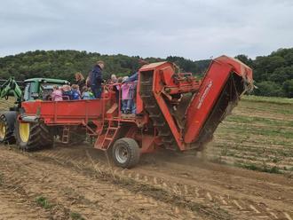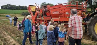 Dann ging es los: Gemeinsam mit den Erziehern bestiegen die Kinder die große Erntemaschine. Die Vorschulkinder durften direkt an die Sortieranlage, wo sie die Kartoffeln genauer unter die Lupe nahmen. Die jüngeren Kinder mussten nicht zuschauen - für sie war eine sichere Plattform auf der Maschine vorbereitet, von der aus sie das Geschehen genauso nah miterleben konnten. Mit großen Augen verfolgten sie, wie sich die Maschine langsam in Bewegung setzte und die Erde ausspuckte. Auf dem Förderband kullerten die frisch geernteten Kartoffeln in Richtung Sortierung. Hier lernten die Kinder, dass grüne oder beschädigte Knollen aussortiert werden müssen, während die guten in die vorgesehenen Behälter weiterwandern. Es war für alle ein besonderes Erlebnis, selbst mit anzupacken und zu sehen, wie viele Kartoffeln in kurzer Zeit zusammenkommen.