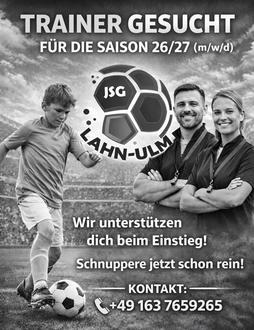 Gesucht werden motivierte Personen, die Freude daran haben, Kinder und Jugendliche im Fußball auszubilden und zu begleiten. Dabei sind sowohl erfahrene Trainerinnen und Trainer als auch interessierte Neueinsteiger ausdrücklich willkommen. Die JSG Lahn-Ulm unterstützt aktiv beim Einstieg und bietet die Möglichkeit, bereits im Vorfeld in den Trainingsbetrieb hineinzuschnuppern.