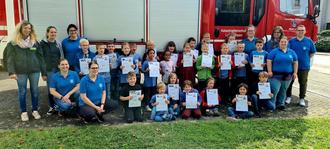 Prüfung erfolgreich bestanden. Die Kinder mit den Betreuern der Kinderfeuerwehren der Stadt Leun