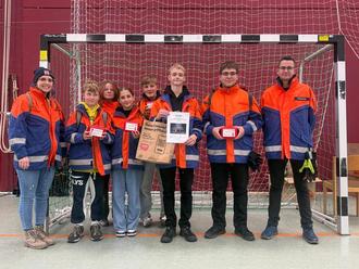 Die Jugendlichen mit Stadtjugendfeuerwehrwart Felix Bremond (rechts) und stellvertretende Stadtjugendfeuerwehrwartin Mariella Sarina Ambrosius (links)