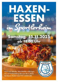 Wir laden ein zum Haxenessen am Samstag, den 15.11.2025 ab 18:00 Uhr im Sportlerheim.