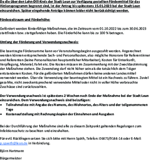 Da die über den Lahn-Dill-Kreis der Stadt Leun zur Verfügung gestellten Fördermittel für das Aktionsprogramm begrenzt sind, ist der Antrag bis spätestens 15.01.2023 bei der Stadt Leun einzureichen. Später eingehende Anträge können leider nicht berücksichtigt werden.