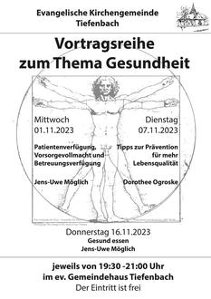| 19.30 – 21.00 Uhr | Vortragsreihe zum Thema Gesundheit im Ev. Gemeindehaus in Tiefenbach mit Jens-Uwe Möglich „Patientenverfügung, Vorsorgevollmacht und Betreuungsverfügung“ |
