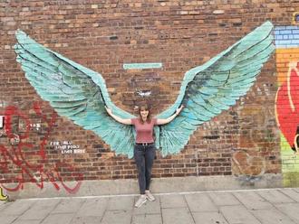 Bei einem Ausflug zu den „Liverwings“ machten wir Fotos vor den künstlerisch gemalten Flügeln an einer Backsteinmauer.