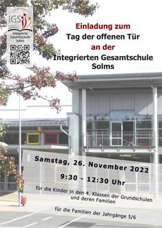 Am Samstag, den 26. November 2022, veranstaltet die Integrierte Gesamtschule Solms in der Zeit von 09:30 Uhr bis 12:30 Uhr ihren „Tag der offenen Tür“.