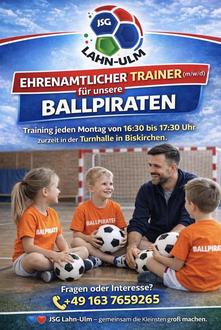 Das Training findet jeden Montag von 16:30 bis 17:30 Uhr statt. Aktuell trainieren die Ballpiraten in der Turnhalle in Biskirchen. Angesprochen sind sowohl fußballerfahrene Interessierte als auch Neueinsteiger - Trainererfahrung ist ausdrücklich keine Voraussetzung. Die JSG Lahn-Ulm begleitet neue Ehrenamtliche beim Einstieg und bietet Unterstützung im Trainingsalltag.