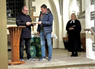 Presbyter Ralf Boch überreicht Tobias Landvogt im Beisein von Pfarrerin Christin Jeworrek ein kleines Geschenk.