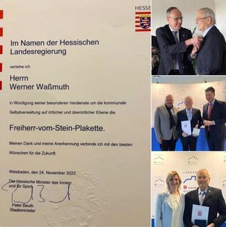 Für sein langjähriges ehrenamtliches Engagement in der Kommunalpolitik wurde an Werner Waßmuth am 24. November 2023 die höchste Auszeichnung des Landes Hessen für kommunale Verdienste - die Freiherr-vom-Stein-Plakette - verliehen. Seit 1977 ist Werner Waßmuth Mitglied in unserer Gemeindevertretung und zudem seit 1981 Kreistagsabgeordneter. Darüber hinaus engagiert er sich noch in zahlreichen Vereinen und überregionalen Verbänden.