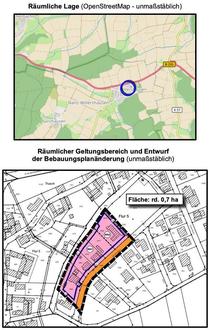 Die räumliche Lage und der Entwurf der 2. Änderung des Bebauungsplan Nr. 1 „Auf dem Berg vor der Struth und die Koitgeswiese“ gehen aus den nachstehenden Übersichtskarten hervor (gestrichelt umrandeter Bereich).