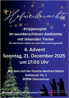 Nach der wunderschönen Stallweihnacht in Niederweimar im Jahr 2024 veranstaltet der Kooperationsraum FlOw dieses Jahr am 4. Advent eine Hofweihnacht auf dem Hof der Familie Manfred Möller in Oberweimar (Koblenzer Str. 1 in 35096 Oberweimar).