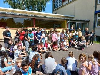In der letzten Stunde fand sich die Schulgemeinschaft bei bestem Wetter auf dem Schulhof zur Vollversammlung. Frau Barra verteilte die jüngst erworbenen Seepferdchen und Schwimmabzeichen in Bronze und Silber an die Viertklässler. Danach wurden kleine Sachpreise an die beiden besten Radfahrprüflinge verteilt. Ebenso wurde unsere Schulsiegerin des Lesedino ausgezeichnet, die unsere Schule im Regionalentscheid vertreten wird.