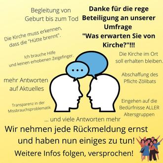 In unserer Sitzung am 11. Juli haben wir uns mit den Ergebnissen der Umfrage „Was erwarten Sie von Kirche?“ beschäftigt. Die Fülle und Vielfalt der Rückmeldungen sind sehr erfreulich und gleichzeitig eine große Herausforderung. Denn nun haben wir es schwarz auf weiß, ganz klar und deutlich formuliert, welche Erwartungen es an Kirche gibt.