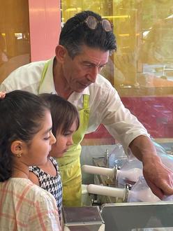 Am Dienstag, den 13.07.2023 war es endlich soweit. Mit 23 Kindern ging es zum Eiscafé Vulcano in Dillingen. Angelo, der Inhaber des Eiscafés hatte uns eingeladen, um uns zu zeigen, wie sein leckeres Eis hergestellt wird. An der Ampel erwartete uns schon Angelo und begrüßte uns herzlich.