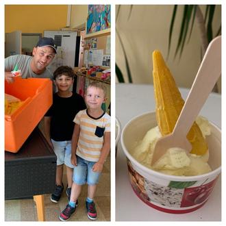 Damit die Kinder und das Personal den Tag bei hohen sommerlichen Temperaturen gut überstehen konnten, kam überraschend der Eismann. Bei genauem Hinsehen erkannten alle Raphael Zims, den 1. Vorsitzenden des Fördervereines. Er hatte vom Eiscafe Vulcano in Dillingen leckere Eisbecher für alle abgeholt und an alle Gruppen verteilt.