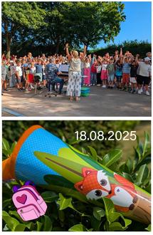 Am 18.08.2025 war es endlich so weit: Die neuen Erstklässler wurden an unserer Schule in die Schulgemeinschaft aufgenommen. Nach einem gemeinsamen Gottesdienst mit der Odilienschule, unter deren Regie wir an dem stimmungsvollen Programm im Saardom teilnahmen, fanden sich die neuen Schulkinder mit ihren Familien auf unserem Pausenhof ein. Dort wurden sie mit einem flotten Liedprogramm der Schülerschaft unter der musikalischen Leitung von Frau Feld und dem Musiker Herry Schmitt herzlich willkommen geheißen. Spätestens bei „Singen ist ne coole Sache“ stimmten die ersten Neulinge mutig ein und sangen mit den Großen mit. Unsere Schulleiterin Frau Hirschauer wünschte in ihrer Begrüßung allen Kindern der Schule ein erfolgreiches Schuljahr und den Erstklässlern einen gelungenen Start ins Schülerleben. Dann wurde es spannend, denn nun rief Frau Hirschauer die Namen der ABC-Schützen auf. Die zweiten Klassen gaben den neuen Mitschülern einen kleinen sonnigen Glücksbringer des Fördervereins mit auf den Weg und zum ersten Mal gingen die Fuchsklasse 1.1 und die Eichhörnchenklasse 1.2 gemeinsam mit ihren Lehrerinnen in ihr Klassenzimmer. Sehr zu unserer Freude konnten wir die Schulneulinge in frisch gestrichene Räume begleiten, denen sie in den nächsten Wochen langsam ihren eigenen Charakter geben werden. Während die Kinder ihre erste Unterrichtsstunde erlebten, konnten sich die Eltern in entspannter Atmosphäre auf dem Schulhof kennen lernen. Für das leibliche Wohl sorgte dabei der Förderverein. Frau Hirschauer und unsere Schulsekretärin übergaben den wartenden Eltern die Schulbücher ihrer Kinder und wurden nicht müde, Fragen zu den Abläufen des Schulalltags zu beantworten. Am Ende durften sich die Erstklässler über ein Willkommensgeschenk der Stadt Dillingen freuen: ein Gutschein für einen kostenlosen Bibliotheksausweis über ein Jahr ist Lernmotivation pur.