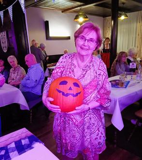 Dann folgte die Bekanntgabe der Siegerin beim Kürbis-Gewichteraten. Die Schätzwerte gingen von 4 bis 11 kg. Das tatsächliche Gewicht lag bei 5.252 g. Waltraud Nalbach kam dem mit 5 Kg am nächsten und freute sich über eine neue Deko für ihren Hauseingang. Die Schätzgelder aus der Aktion gingen an die Vereinskasse.