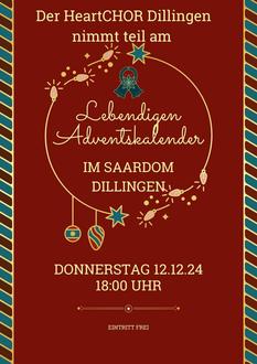 Am Donnerstag, 12. Dezember 2024 lädt der „Heartchor“ Dillingen um 18:00 Uhr in den Saardom zum „lebendigen Adventskalender“ ein. In einer halbstündigen Feierstunde bietet der Chor unter seinem Leiter Thomas Bernardy vorweihnachtliche Chormusik und Texte, die auf das große Fest einstimmen. Herzliche Einladung zu dieser kleinen Auszeit im Advent.