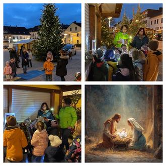 Im Rahmen des „Lebendigen Adventskalenders“ der Pfarreiengemeinschaft St. Odilia hat auch der Kindergarten St. Maximin wieder vor allem Eltern und Kinder, aber auch die ganze Pfarrei eingeladen. Die Erzieherinnen Annette Winter und Katja Bergum haben an den Weihnachtshäuschen, die schon auf dem Kirchplatz in Pachten stehen, Bilder zu einer biblischen Geschichte aufgehängt. Nach einer kurzen Begrüßung machten sich alle auf den Weg, die Bilder nach und nach zu sehen und die Erzählung zu hören. Damit die Bilder in der beginnenden Dunkelheit zu erkennen waren, bekam jedes Kind eine Taschenlampe mit dem Auftrag, die Bilder anzustrahlen. Frau Winter erklärte, dass wir uns gemeinsam auf den Weg zur Krippe nach Bethlehem machen. Aber dafür wurden alle auf den Bildern vorgestellt, die auch damals dabei waren: Maria und Josef, der Engel, die Hirten, Schafe und die drei heiligen Könige. Neben den Bildern waren auch Figuren zu sehen wie die Engel oder Maria und Josef.